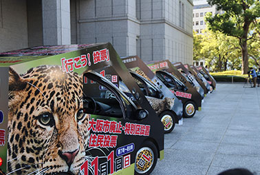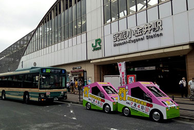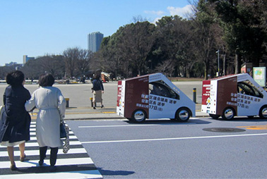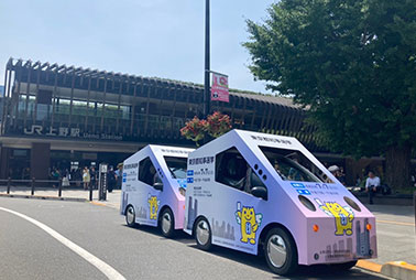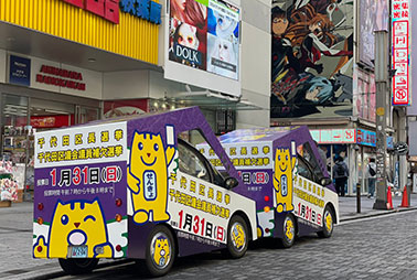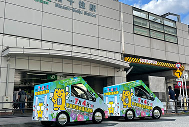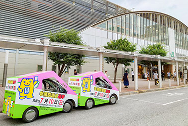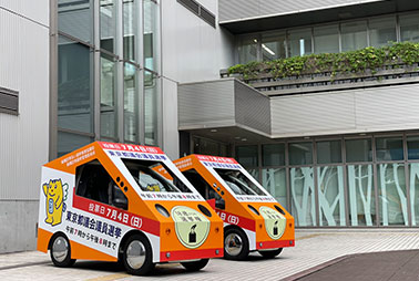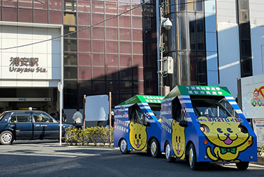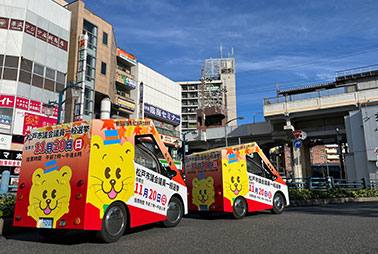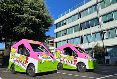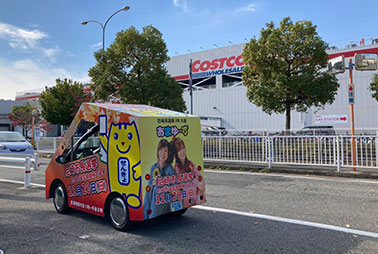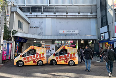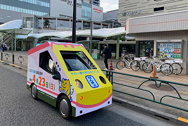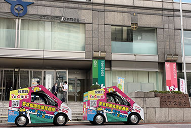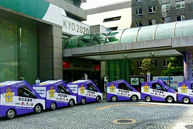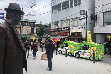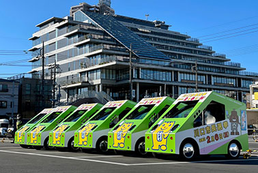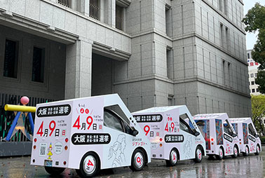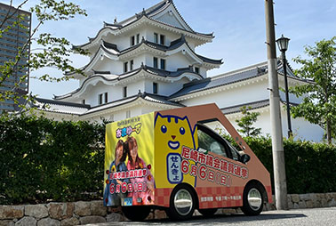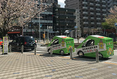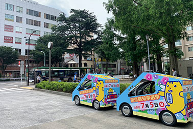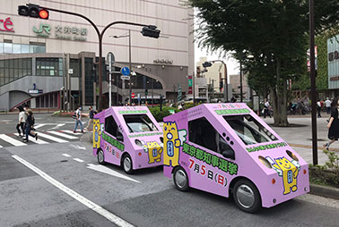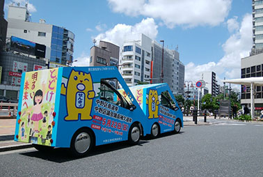 市役所にて出発式を催し、多くのメディア関係各社が集まりました。平日は市内を4つのエリアに分け2台1組ずつ走行し、休日は主要2エリアを4台1組で走行しました。出発式の様子等を多くのメディアに取り上げられ注目されました。